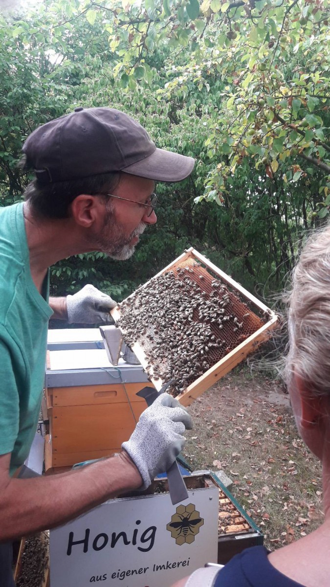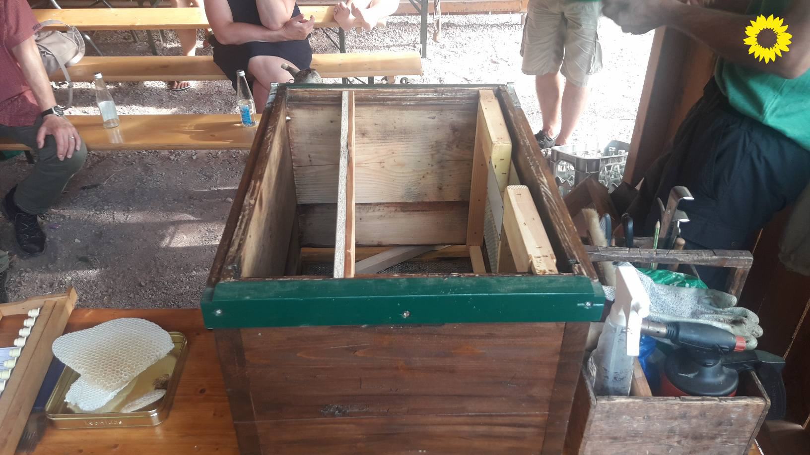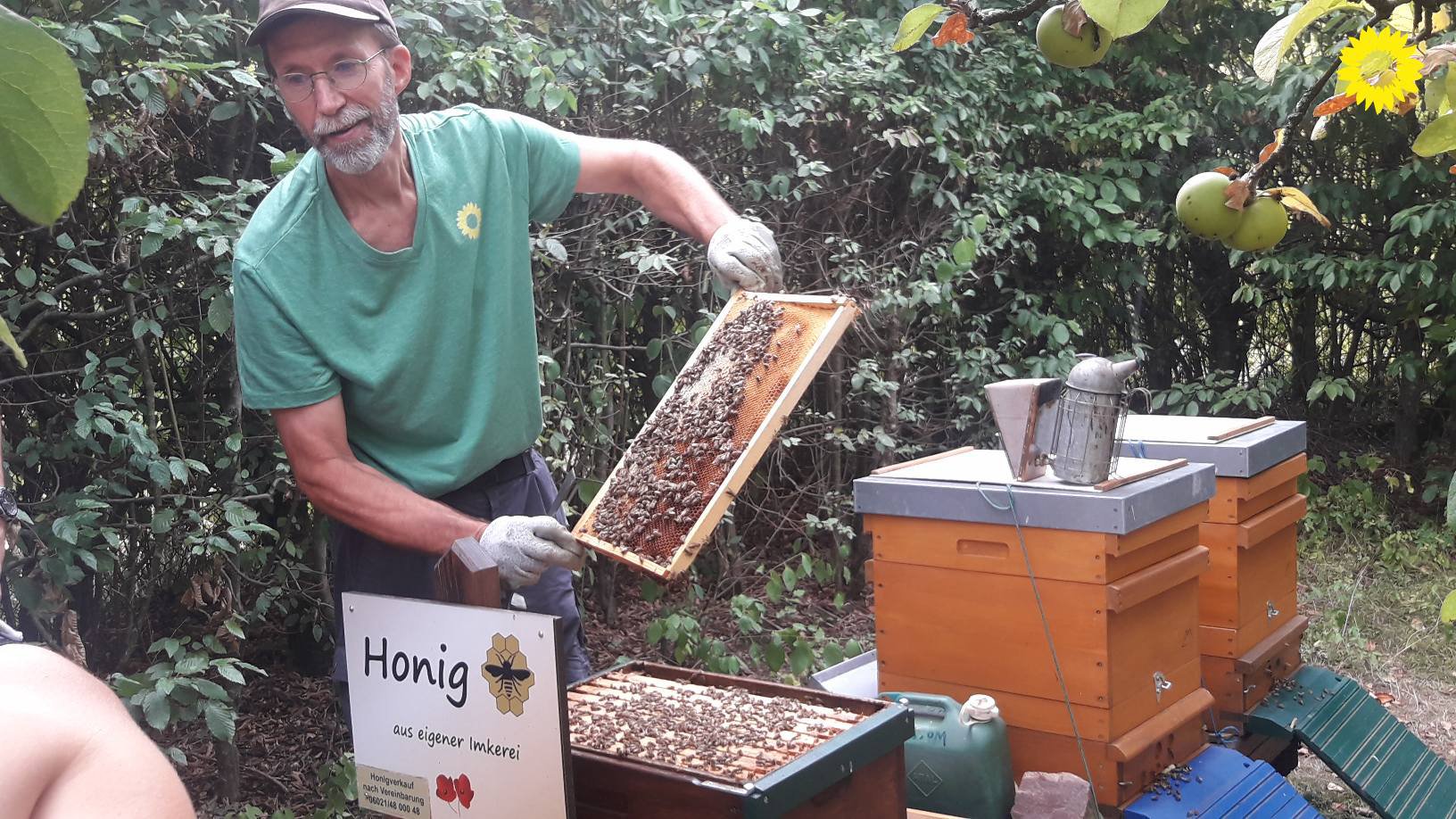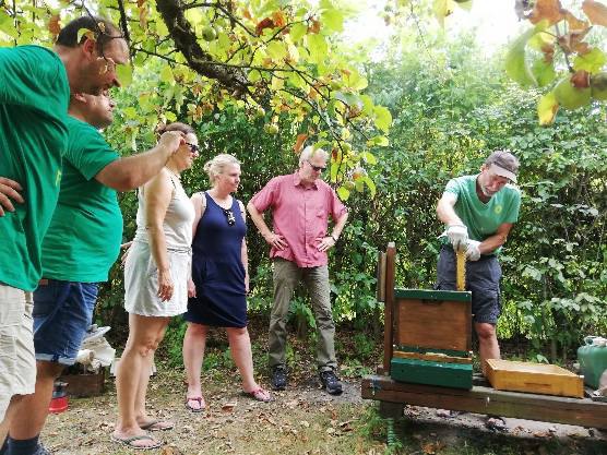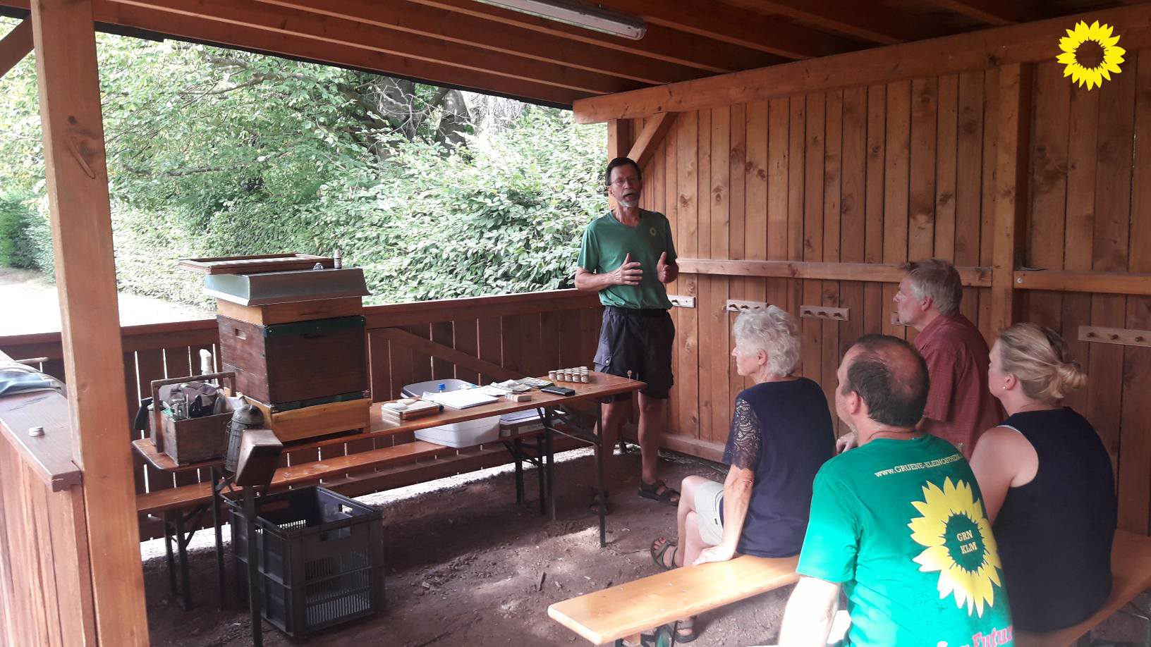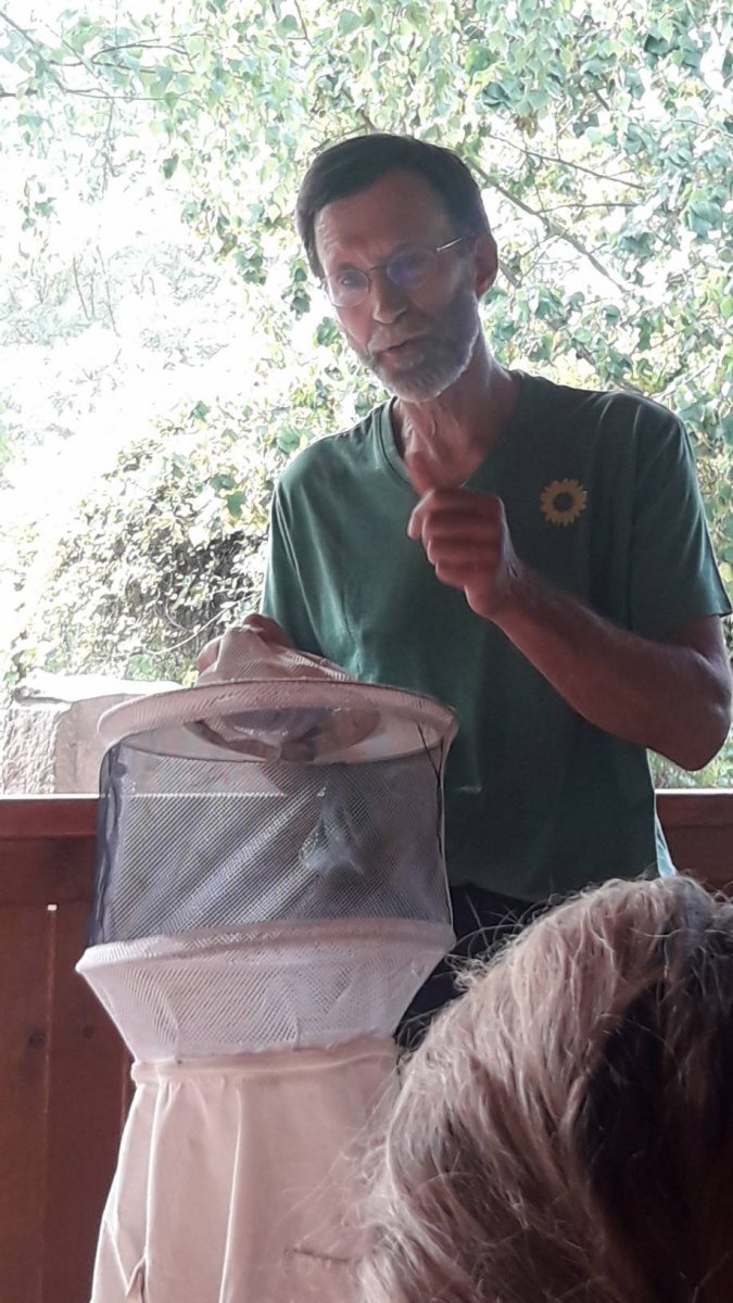Am 26. Juli gab Helmut Siegert (Vorstand im OV der Grünen in Kleinostheim) im Naturerlebnisgarten des LBV Kleinostheim einen Einblick in die Bewirtschaftung von Honigbienen. Den praktischen Umgang zeigte er anhand der Bienenbehausung (auch „Beute“ genannt).