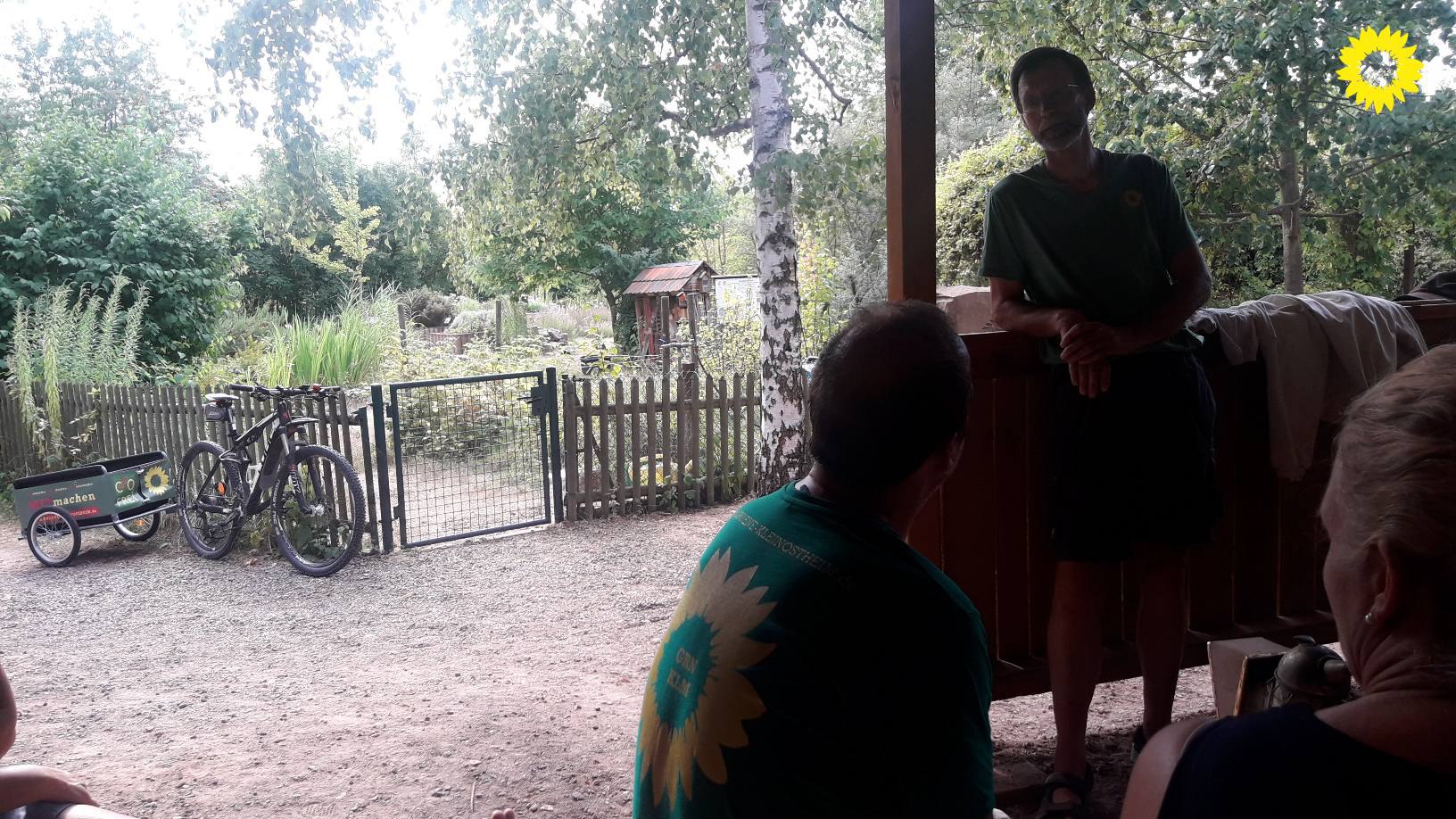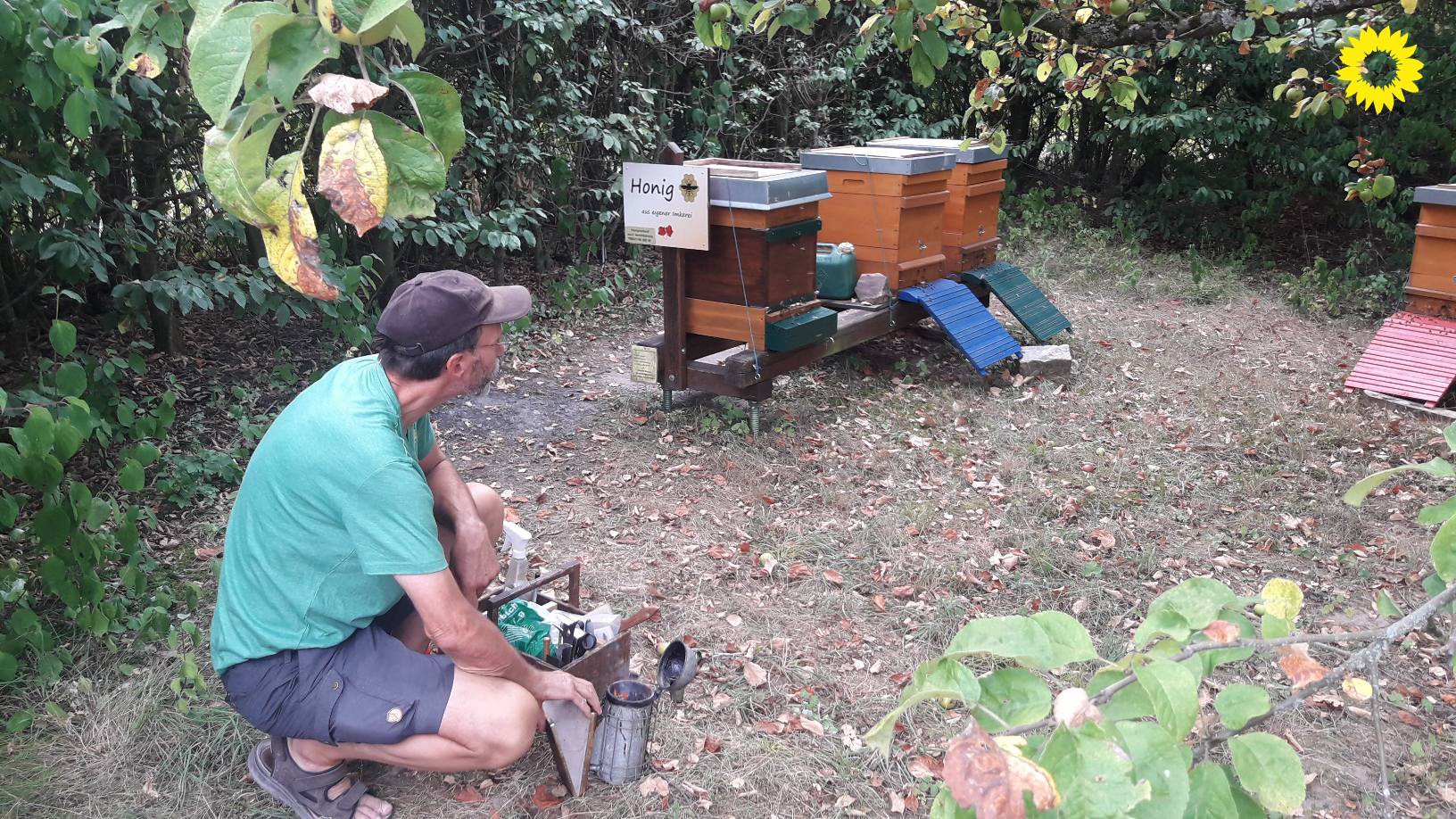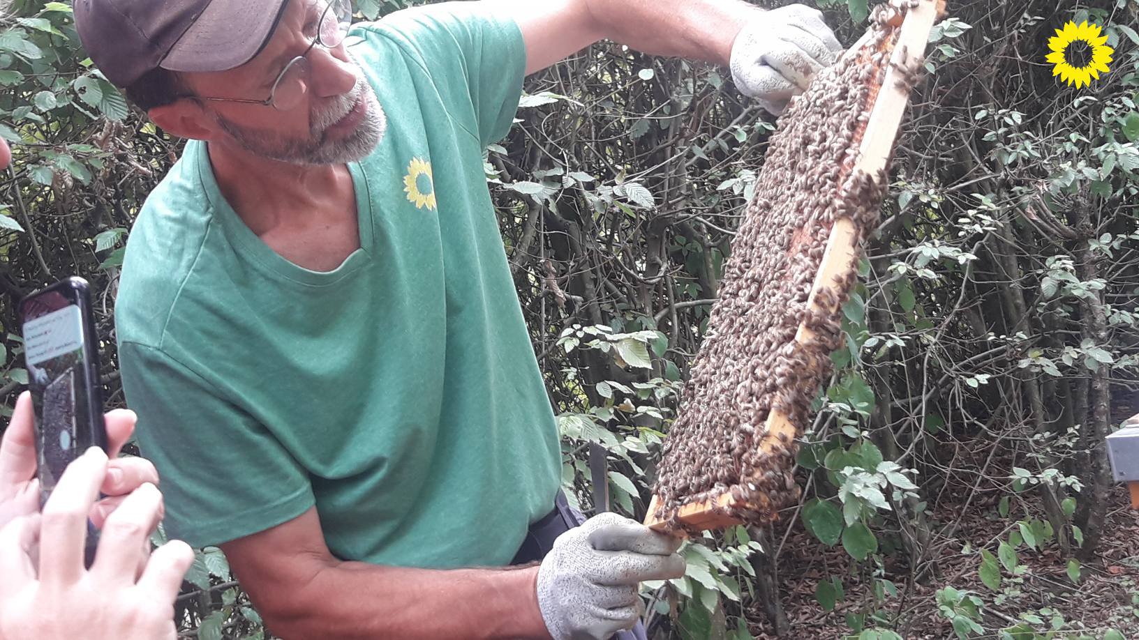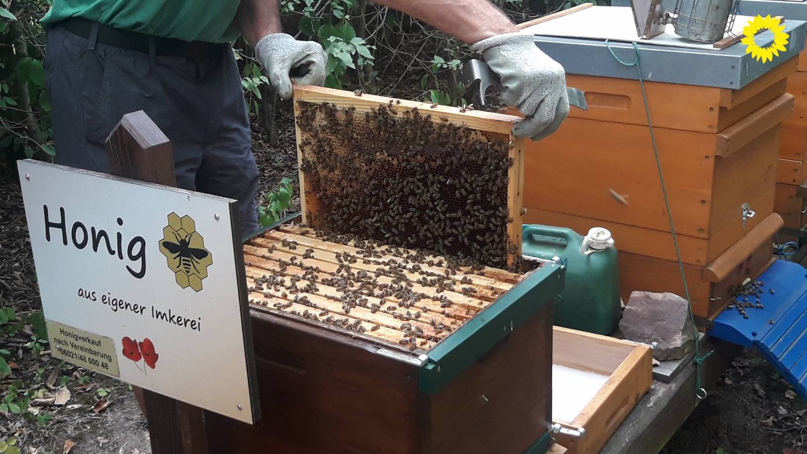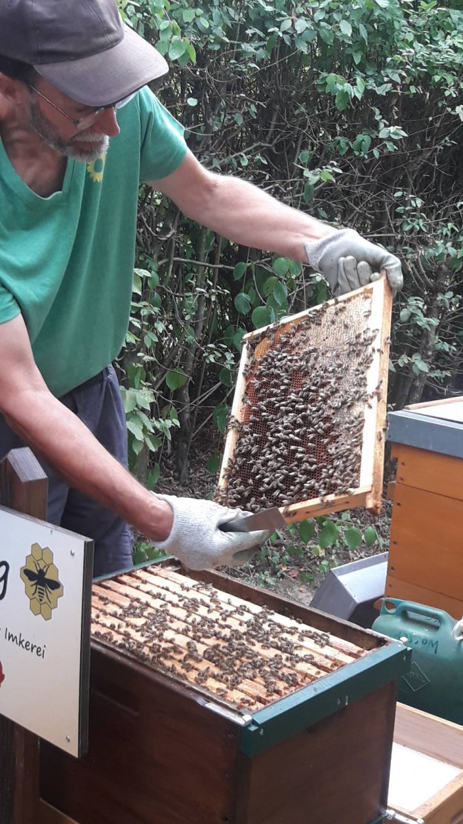 Am 26. Juli gab Helmut Siegert (Vorstand im OV der Grünen in Kleinostheim) im Naturerlebnisgarten des LBV Kleinostheim einen Einblick in die Bewirtschaftung von Honigbienen. Den praktischen Umgang zeigte er anhand der Bienenbehausung (auch „Beute“ genannt).