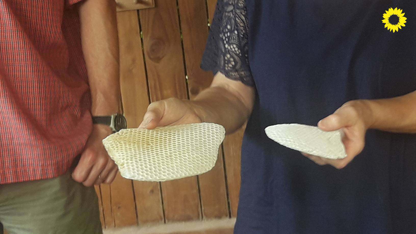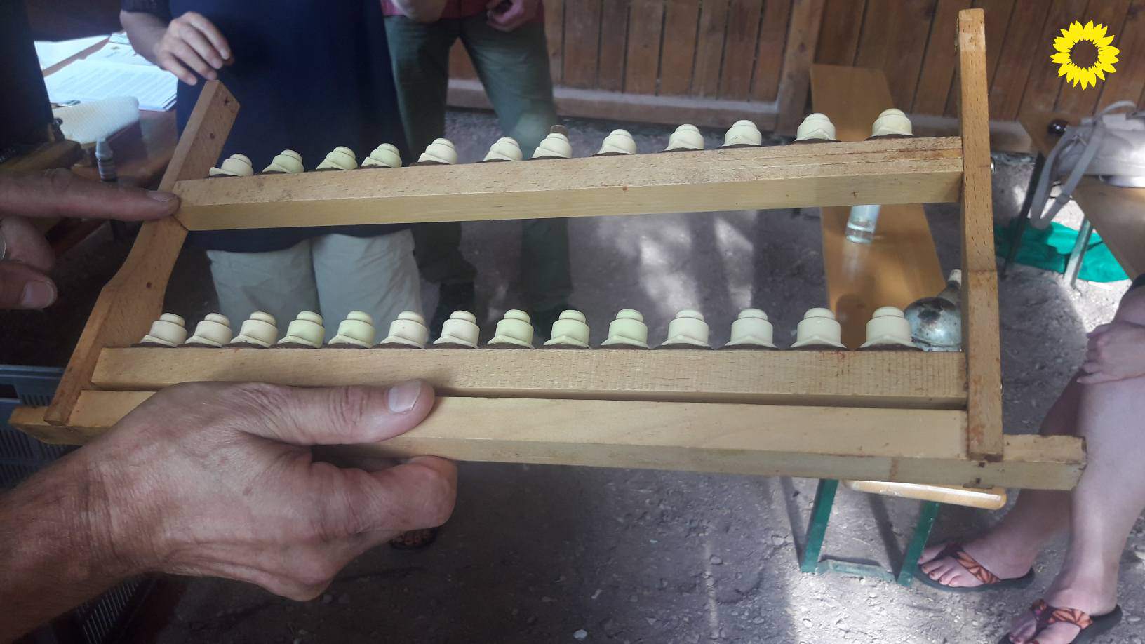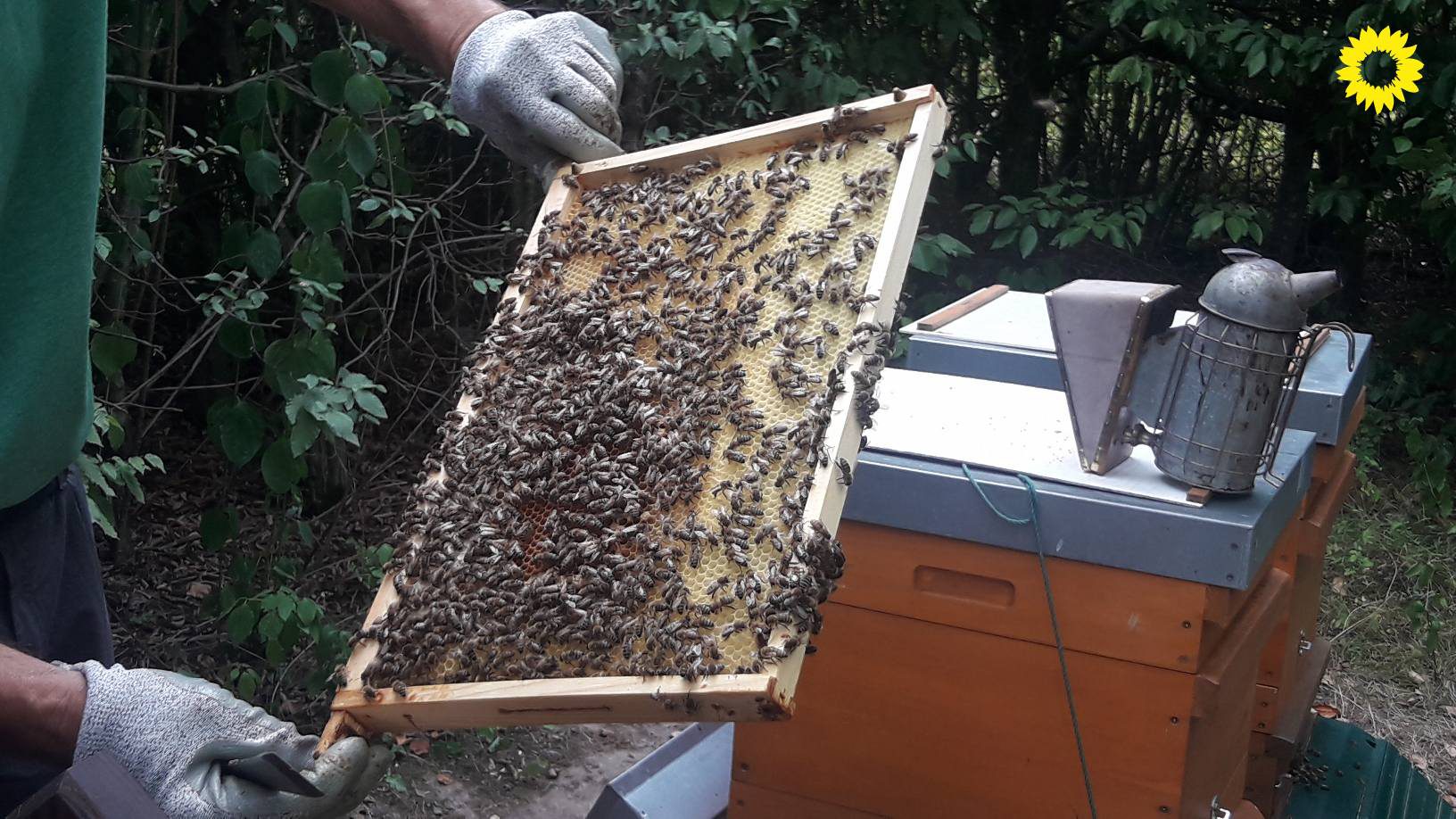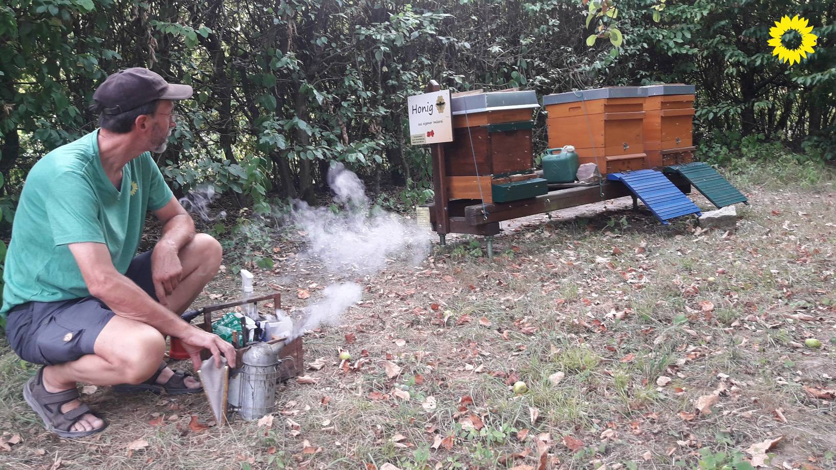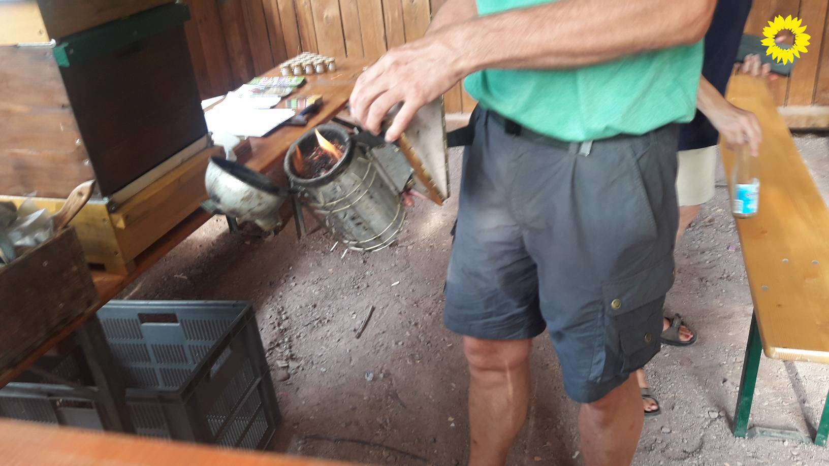 Am 26. Juli gab Helmut Siegert (Vorstand im OV der Grünen in Kleinostheim) im Naturerlebnisgarten des LBV Kleinostheim einen Einblick in die Bewirtschaftung von Honigbienen. Den praktischen Umgang zeigte er anhand der Bienenbehausung (auch „Beute“ genannt).
