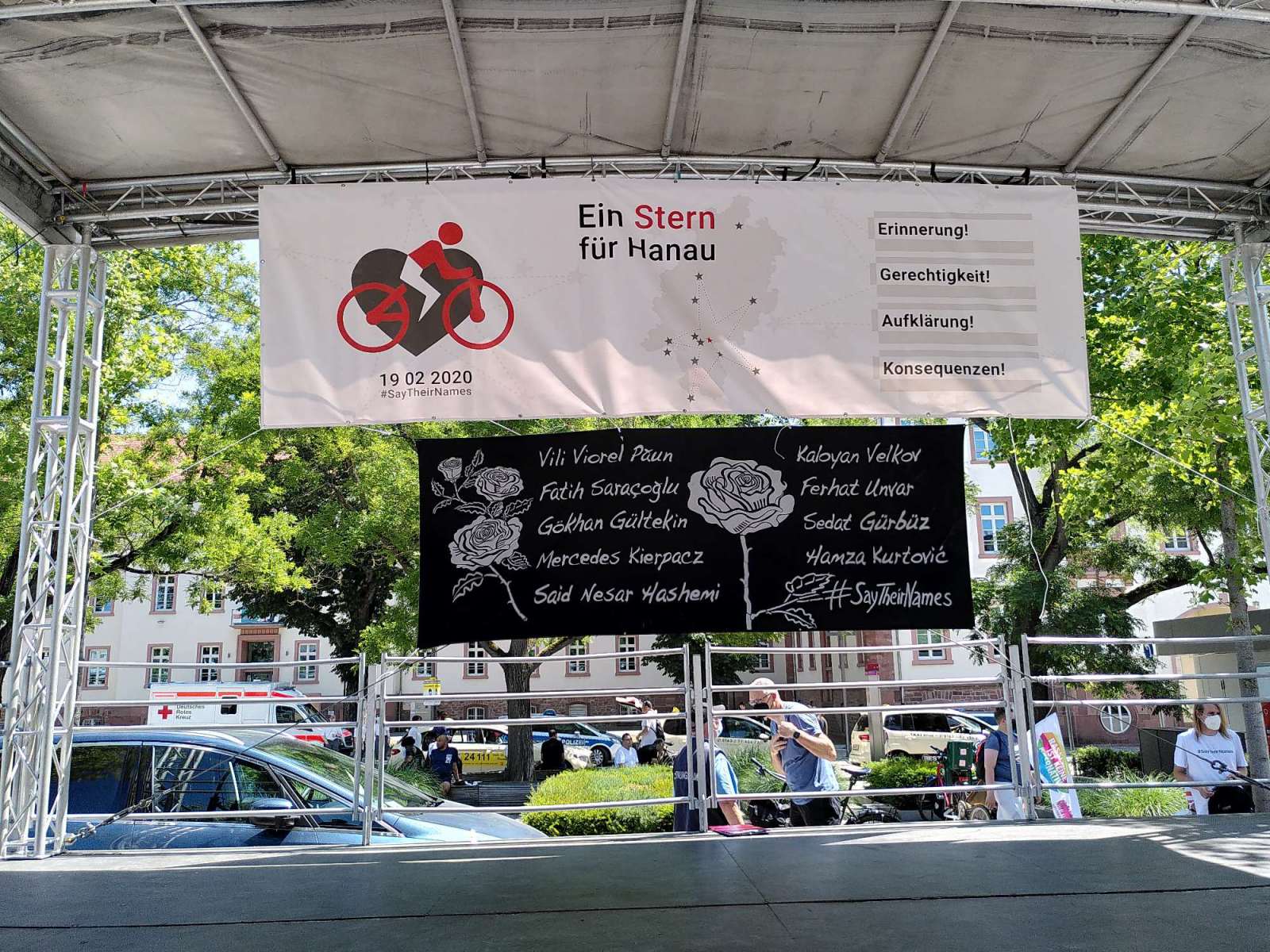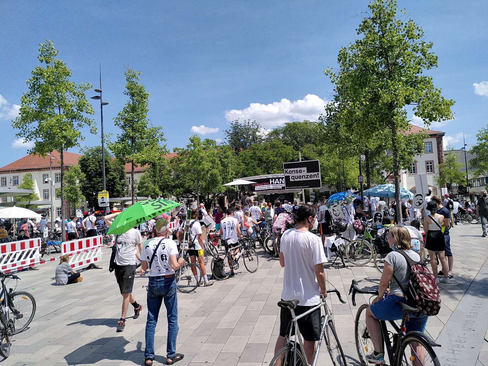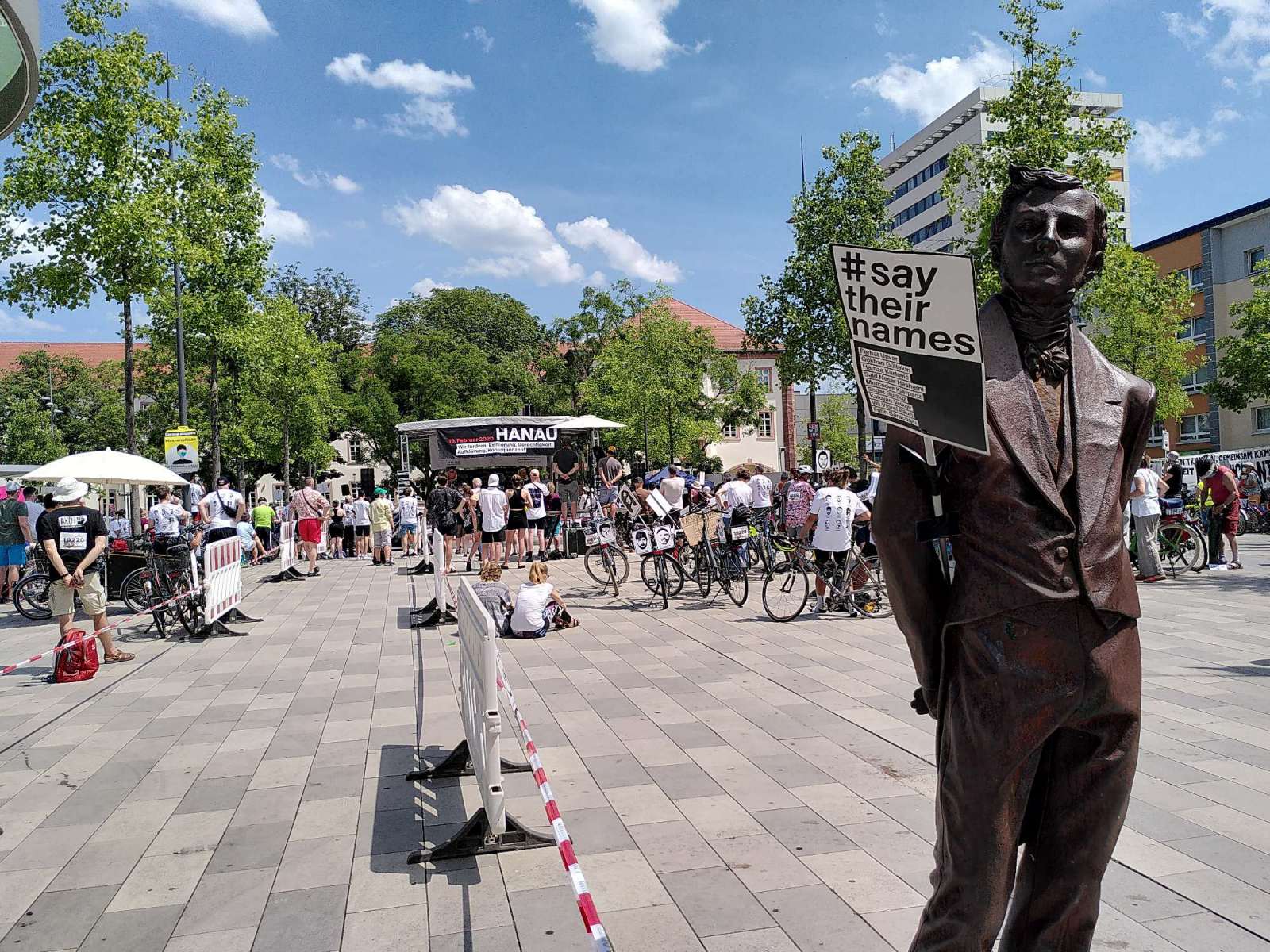 In Hanau angekommen, trafen viele verschiedene Radfahrende aus dem Rhein-Main Gebiet ein. Circa 700 Menschen hörten den bewegenden Ansprachen der Angehörigen und Familien zu. Hanaus Oberbürgermeister Kaminski forderte die Übernahme der politischen Verantwortung von Innenminister Beuth und Newroz Duman von der „Initiative 19. Februar“ kritisierte die hessische Landesregierung für den unwürdigen Umgang mit dem rassistischen Morden. Es kann nicht sein, dass Angehörige, Überlebende und Betroffene um Aufklärung kämpfen müssen, der Opferfond nicht weit genug geht und immer wieder Fälle von Rechtsextremismus in den Behörden bekannt werden.