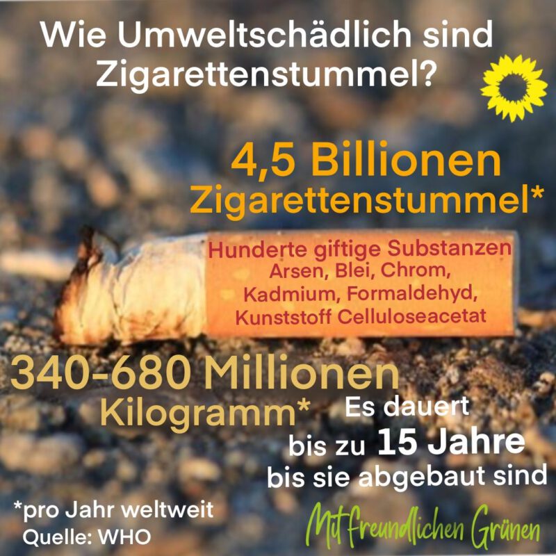 Hier im Bericht auch ein interessanter Film zum Thema Zigarettenkippen: „Der häufigste Plastikmüll der Welt? ZigarettenfilterZigarettenfilter bestehen aus dem Kunststoff Celluloseacetat. Landen die benutzten Filter in der Umwelt, kleben an ihnen auch Nikotin, Schwermetalle und andere Schadstoffe, die darüber in Gewässer gelangen. Die Lösung des Problems ist naheliegend.“