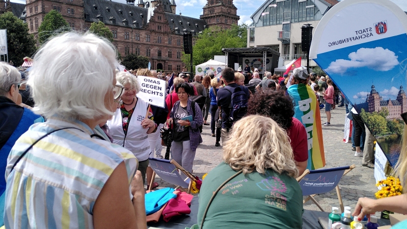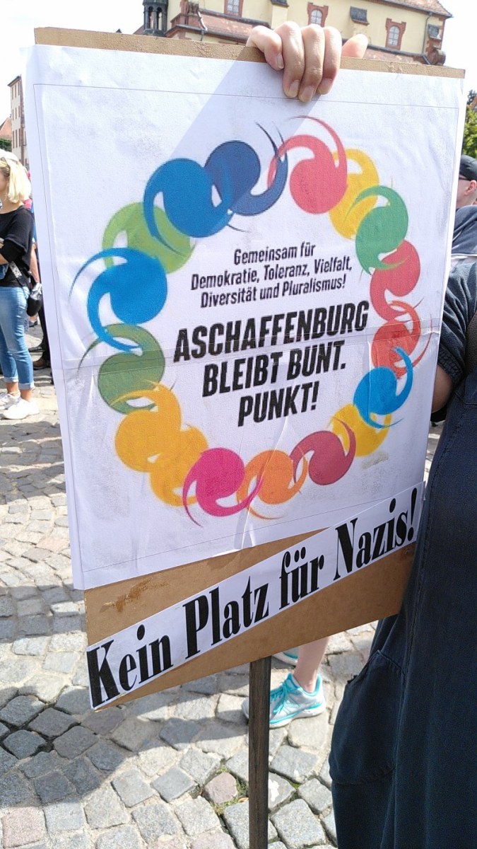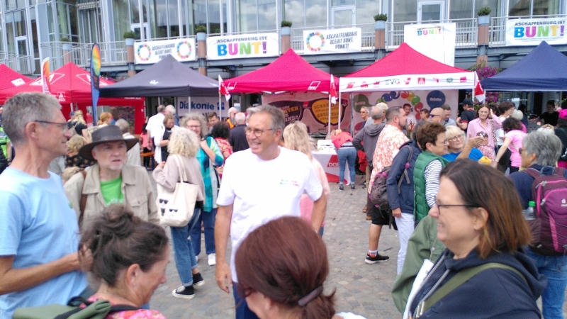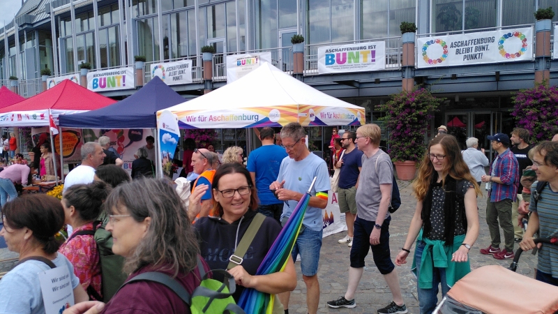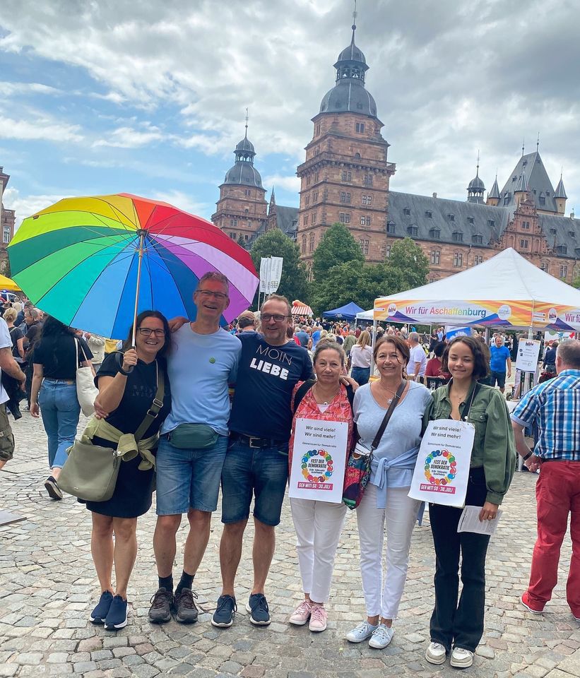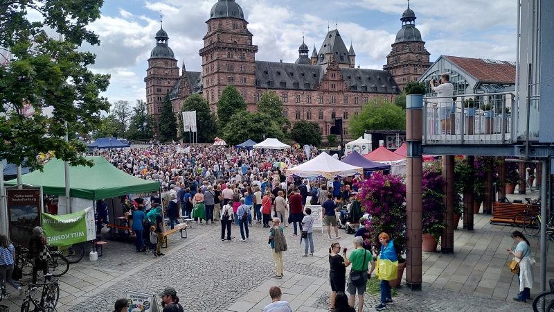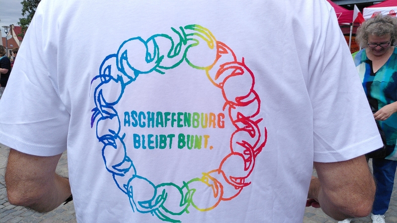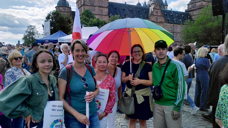 Rund 3500 Menschen sind am 30. Juli in Aschaffenburg für Vielfalt und Weltoffenheit auf die Straße gegangen. In drei Zügen sind die Teilnehmer*innen zum Schlossplatz gelaufen, um dort mit Musik, Kabarett und Tanz ein Fest der Demokratie zu feiern.