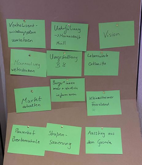 Und so lebendig wie der Austausch, so vielfältig waren die Themen und Ideen: eine attraktive Ortsmitte und mehr Wohnraum, Tempo 30 im Ort und die Situation an der B8, Gestaltung des Pausenhofs an der Brentanoschule, Erhalt des Markts und Sanierung des Vitamars, Verschönerung des Kreisels am Ortseingang und Verbesserung des Nahverkehrs, Sanierung von Kanälen und Straßen, Richtlinien für Gewerbeansiedlungen und mehr Bürger*innenbeteiligung, Ausstattung des BRK, die 17 UN-Nachhaltigkeitsziele und die Anträge der GRÜNEN (mehr als 50 in 6 Jahren), von denen einige von der Verwaltung noch nicht bearbeitet wurden …
