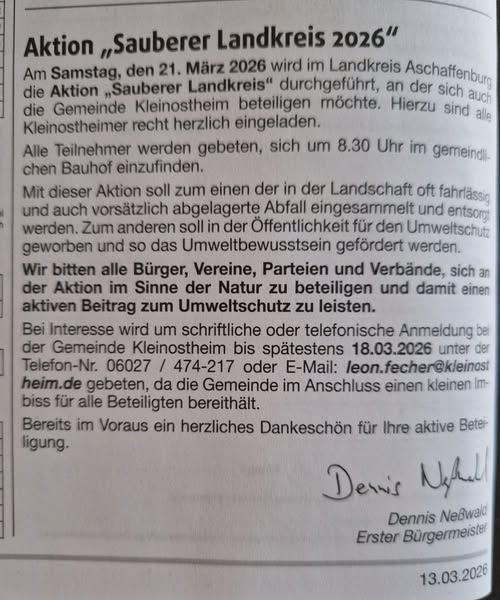 Die Gemeinde Kleinostheim lädt zur Aktion „Sauberer Landkreis“ ein. Alle Bürgerinnen und Bürger sind herzlich willkommen, sich zu beteiligen und gemeinsam etwas für eine saubere Umwelt zu tun.