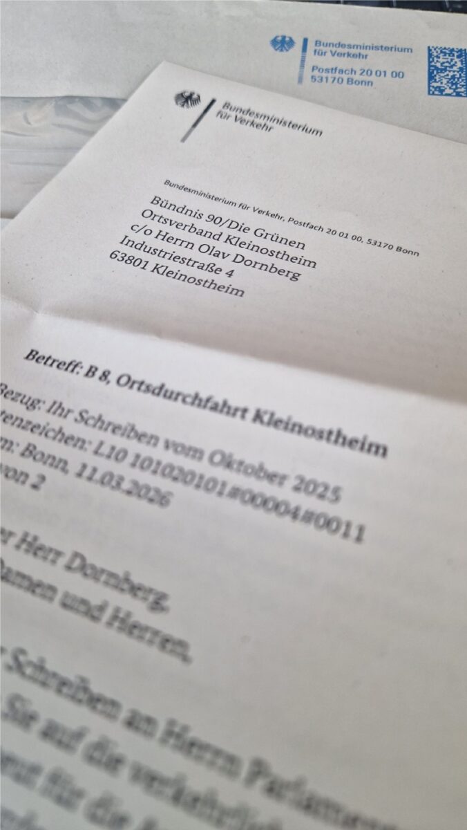 Das Bundesministerium für Digitales und Verkehr hat erneut klargestellt, dass die Entscheidung über mögliche Durchfahrtsbeschränkungen in der Ortsdurchfahrt von Kleinostheim nicht in seiner Zuständigkeit liegt (Wegfall der Bedarfsumleitung). Im Antwortschreiben auf unseren Brief an den Parlamentarischen Staatssekretärs Ulrich Lange wird betont, dass entsprechende Maßnahmen durch die örtlich zuständigen Straßenverkehrsbehörden zu prüfen und anzuordnen sind.