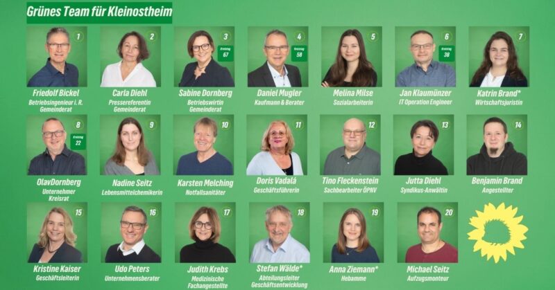 Gute Politik für das Klima und für alle Generationen . Grüne Fraktion im Gemeinderat von 2020 bis 2026 . GRÜNE-Anträge . Aktuelles aus dem Gemeiderat . Grünes Team für Kleinostheim Kandidat*innen für die Gemeinderatswahl sowie die Kreistagswahl 2026 . Grünes Programm „Heimat gestalten und bewahren“ .