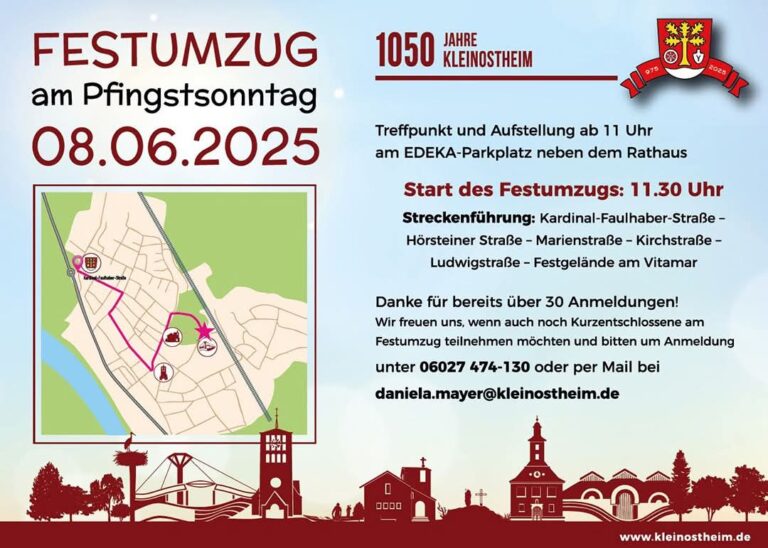 Festwochenende 1050 Jahre Kleinostheim An diesem Pfingst-Wochenende findet der Höhepunkt der 1050-Jahr-Feierlichkeiten in Kleinostheim statt. PROGRAMM: FREITAG, 06.06.202515 Uhr Festbetrieb20 Uhr 70s-Night mitHot-Stuff SAMSTAG, 07.06.202514 Uhr Festbetrieb20 Uhr Rockability-Party mit Boppin’B & DOUG HOLLIDAY […]