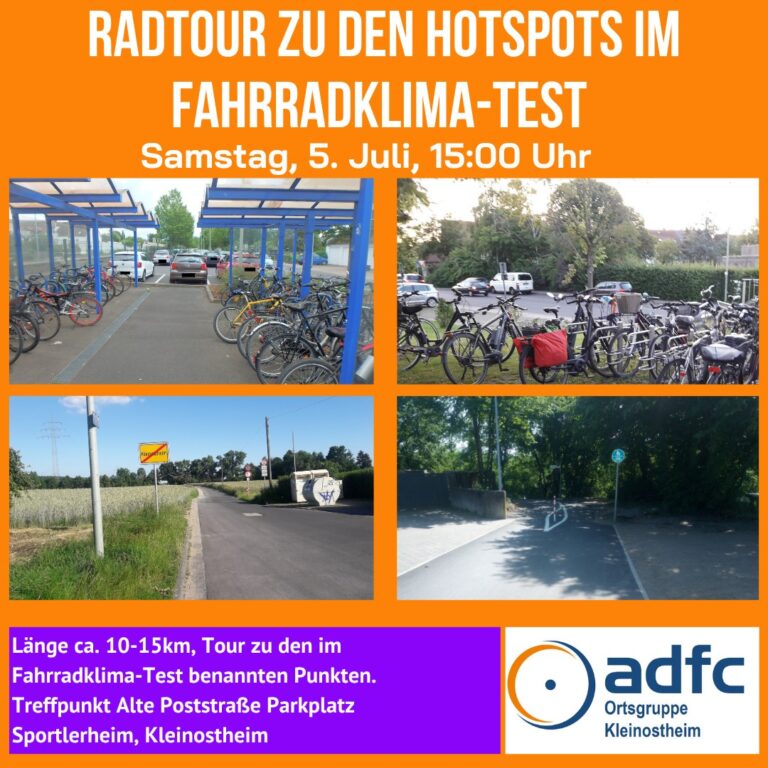 ADFC: Rad-Tour zu den Hotspots des Fahrradklima-Tests Eine Versanstaltung der ADFC-Ortsgruppe Kleinostheim, die wir gerne teilen: „Wir fahren in Kleinostheim zu den verschiedenen im Fahrradklimatest genannten Punkten und beantworten Fragen. Gerne nutzen wir die Gelegenheit der Diskussion […]